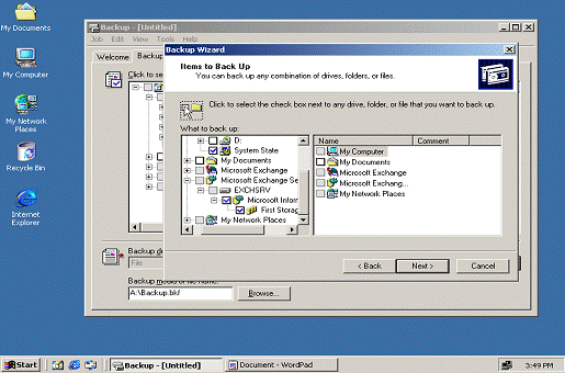 -Alegem 'Back up selected files,drives, or network data' si selectam, alaturi de 'System State' pentru restaurarea configuratiei serverului cu Exchange 2000,si 'Microsoft Information Store' din 'Microsoft Exchange Server' pentru restaurarea mailbox-urilor.
