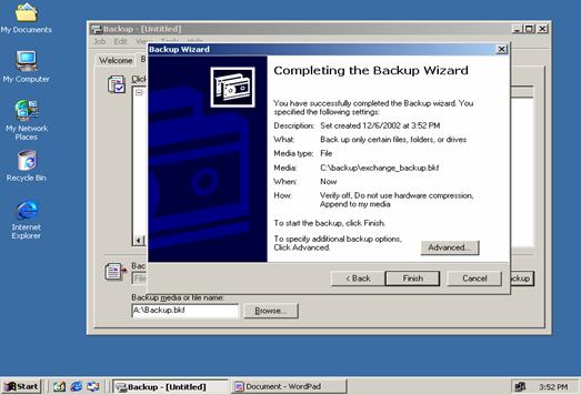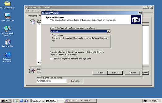 -inainte de final se alege optiunea 'Advanced' unde specificam tipul backup-ului(normal,incremental,diferential),verificarea datelor dupa salvare.