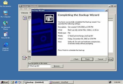 -daca avem unitate de banda se poate alege optiunea de adaugare a datelor sau de inlocuire a lor pe banda-Next-specificam descrierea salvarii si a benzii pe care se face salvarea-contul de user sub care ruleaza jobul de backup-se poate configura si repetarea jobului in zilele si la ore alese de noi-Finish.
