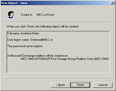 Apare fereastra de confirmare a atributelor contului si se face clic pe butonul < Finish >.