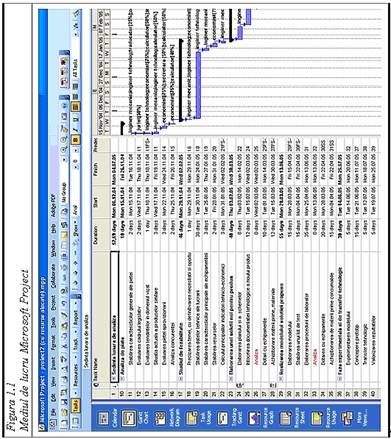 Microsoft Project lucreaza intr-o fereastra echipata cu traditionalele bare de meniuri, de instrumente (toolbars), la care se adauga un panou lateral stanga ce contine pictograme-butoane ce permit comutarea intr-un anumit mod de vizualizare (din cele cateva zeci existente) a unui proiect. In figura 1.1 se poate vedea cum arata o fereastra Microsoft Project in modul de vizualizare Gantt Chart. Modalitatile concrete de operare vor fi prezentate pe parcursul dezvoltarii unei aplicatii (studiu de caz).