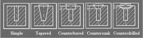 De asemenea, asa cum s-a aratat anterior, tot din fereastra de dialog 'Hole Definition', se mai definesc tipul gaurii si parametrii de filetare ai acesteia.