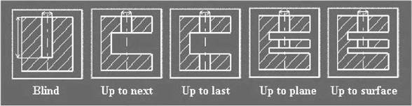 Odata pozitionarea incheiata, se indica diametrul gaurii si limita de adancime pe care aceasta se executa (vezi figura 3.36). Cu exceptia tipului de limita 'Blind', toate celelalte limite sunt calculate automat de program, valorile lor sunt afisate in campul 'Depth', dar nu pot fi modificate de utilizator.