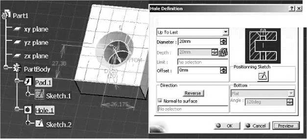 Crearea unei gauri presupune mai multe etape si conditii, prima dintre acestea fiind existenta unui corp, de forma oarecare, pe care se va pozitiona gaura respectiva. in arborele de specificatii se selecteaza o fata a corpului (Pad.l), apoi se apasa pe pictograma 'Hole', afisandu-se fereastra de dialog 'Hole Definition'. in figura 3.38 se observa ca aceasta fereastra de dialog ofera posibilitatea definirii tipului de limita pentru executarea gaurii, a diametrului si directiei sale (implicit, normala la suprafata), dar si a pozitiei centrului cercului ce defineste gaura.