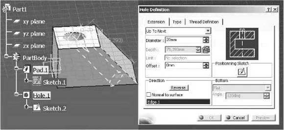 Pentru exemplificare, in modulul CATIA Sketcher se creeaza un profil de forma unui trapez (Sketch. 1), care se extrudeaza pana formeaza corpul Pad.l din figura 3.39. Se selecteaza fata superioara a corpului si se apasa pictograma 'Hole' pentru a pozitiona gaura. in fereastra de dialog 'Hole Definition', prin apasarea butonului [Positioning Sketch] se modifica pozitia gaurii, iar in zona 'Direction' se debifeaza optiunea 'Normal to surface'. in mod predefinit, CATIA creeaza gaura perpendicular pe suprafata. in acest caz, insa, este necesar ca axa gaurii sa fie paralela cu muchia inclinata a trapezului (Edge.l), care devine, din acest moment, noua directie de orientare a axei (figura 3.39).