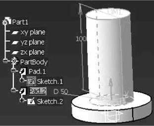 Se selecteaza suprafata plana superioara a cilindrului respectiv, apoi, in modulul CATIA Sketcher se traseaza un cerc (Sketch.2), concentric cu primul (Sketch.l), de diametru 50 mm. Cu