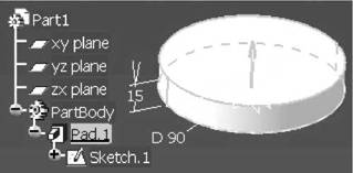 Utilizand instrumentul de modelare Pad din modulul CATIA Part Design se extrudeaza cercul, cu o valoare de 15 mm, obtinandu-se un cilindrul Pad.l, reprezentand corpul flansei de prindere.
