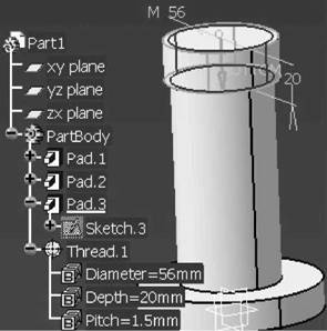 ajutorul instrumentului de modelare Pad se extrudeaza si acest cerc cu o valoare de 100 mm, in acelasi sens cu prima extrudare. Rezulta, astfel, un al doilea cilindru {Pad.2), pozitionat ca in figura 3.159. La capatul superior al celui de-al doilea cilindru {Pad.2) se creeaza un alt cilindru {Pad.3), cu diametrul de 56 mm si inaltimea de 20 mm, pe care se executa un filet metric de prindere (M56), cu ajutorul instrumentului de modelare Thread/Tap (figura 3.160).