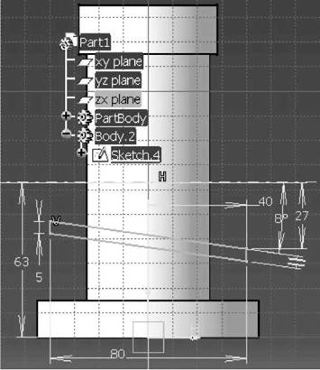 Din meniul [Insert] -> [Body] se adauga in arborele de specificatii un corp {Body.2) care va fi utilizat intr-o operatie booleana cu primul corp {PartBody). Astfel, in planul ZX, perpendicular pe planul XY, utilizand modulul CATIA Sketcher, se deseneaza si se constrange un paralelogram {Sketch.4). De asemenea, in acelasi plan se traseaza si o axa de simetrie, orizontala, aflata la distanta de 63 mm fata de capatul cu flansa al corpului de robinet. intre axa, paralelogram si corpul PartBody se adauga constrangeri de pozitie si de paralelism, asa cum rezulta din figura 3.161.