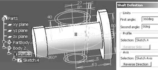 Paralelogramul creat anterior se foloseste pentru a obtine un trunchi de con, prevazut cu alezaj conic (figura 3.162), prin rotirea sa completa (360) in jurul axei trasate in planul ZX. in acest scop se utilizeaza instrumentul de modelare Shaft din modulul CATIA Part Design.
