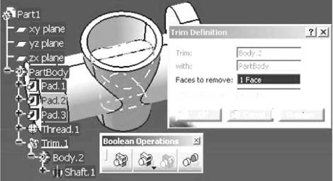 in continuare, trunchiul de con creat se intersecteaza cu cilindrul Pad.2, punand in comun un anumit volum de material. Acesta trebuie inlaturat pentru a indeplini rolul functional al corpului de robinet. Astfel, se utilizeaza instrumentul de modelare Union Trim din bara de instrumente Boolean Operations.
