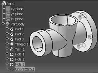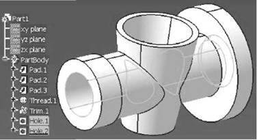 in continuare, se creeaza inca un alezaj, cilindric, orizontal, de diametru 35 mm, obtinut cu ajutorul instrumentului de modelare Hole, in interiorul celor trei cilindri (Pad.l, Pad.2 si Pad.3), asa cum rezulta din figura 3.164. De asemenea, la capatul dinspre flansa de prindere, alezajul respectiv se teseste 5 x 30.