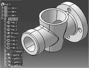 Pentru a finaliza corpul de robinet, se teseste (instrumentul de modelare Chamfer) muchia care contine inceputul filetului si se racordeaza (instrumentul de modelare Edge Fillei) toate muchiile de intersectie intre trunchiul de con, cilindrul Pad.2 si flansa Pad.l, rezultand modelul final al corpului de robinet (figura 3.166).