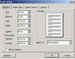 Cele mai simple comenzi referitoare la marginile documentului se pot seta si de la rigla prin deplasarea cu mouse-ul a portiunilor gri. Daca dorim setari mai exacte trebuie sa folosim sistemul de meniuri File- PageSetup.