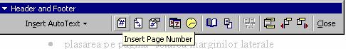 Va apare setul de ustensile destinate redactarii capului de pagina- si cursorul se va plasa in zona superioara a paginii. Aici vom introduce textul corespunzator titlului documentului. In continuare comutam la subsolul de pagina, si din ustensile activam butonul Insert Page Number, ne plasam cu cursorul la marginea dreapta a liniei si activam butonul ce insereaza data. Salvati documentul creat sub numele Formatari.doc in directorul de test.