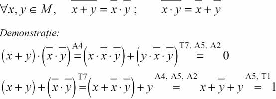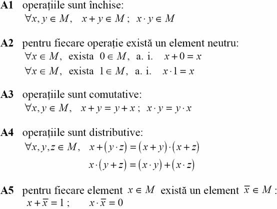 O algebra booleana este un ansamblu <M,+,*,=> format din multimea suport M cu un numar finit de elemente, operatia binara SAU notata cu simbolul +, operatia binara SI notata cu simbolul * si o relatie echivalenta intre elementele multimii M, notata cu simbolul =, daca sunt indeplinite urmatoarele 6 axiome: