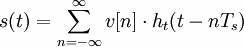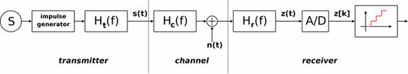 Considerand schema din figura de mai sus, simbolurile v[n] sunt generate aleator de sursa S, iar apoi generatorul de impulsuri creeaza impulsuri cu aria de v[n]. Acestea sunt trimise catre filtrul ht(f) pentru a fi directionate apoi catre canal. Cu alte cuvinte, pentru fiecare simbol se trimite o unda purtatoare diferita, cu amplitudinea relativa.