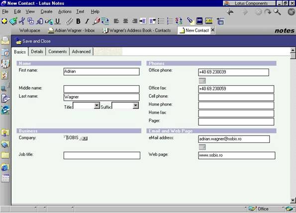 Advanced Folositi pagina Advanced pentru optiuni suplimentare, de exemplu, poate doriti sa setati o comunicare securizata cu persoana respectiva. In aceasta pagina, adaugati-i numele complet de utilizator si un nume pe care sa-l folositi in corespondenta. Numele complet este numele ierarhic Notes, de exemplu Adrian Wagner/SOBIS/RO. Puteti sa adaugati si alte nume in campul respectiv si in acest caz la adresarea unui email se poate folosi oricare dintre numele din campul Full user name sau Short name. Trebuie introdus si numele domeniului de mail in campul respectiv. Daca doriti sa comunicati folosind email-uri criptate si nu aveti acces la Domino Directory sau Public Address Book-ul organizatiei persoanei respective, puteti copia cheia trimisa in campul Certified public key sau Flat name key daca organizatia utilizatorului nu foloseste numele ierarhice. Cand aveti cheia corecta, puteti decripta email-urile receptionate. Mai puteti specifica categoria din care face parte contactul. Deasemenea, puteti alege un fundal grafic pentru acest contact anume, care are prioritate fata de preferintele specificate in PAB. De asemenea, puteti suprascrie setarea afisarii numelui (Nume - Prenume) pentru acest caz particular.