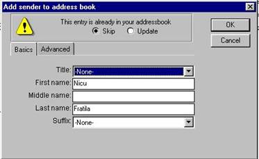 Puteti adauga o persoana in lista proprie de contacte PAB, direct din casuta de mail Notes. Deschideti un mesaj primit de la persoana in cauza. Selectati Actions - Tools - Add Sender to Address Book pentru a vedea fereastra de dialog din figura 3: