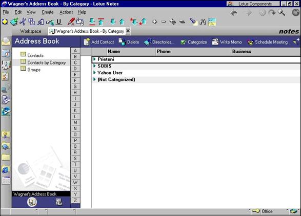 Scopul primordial al oricarei aplicatii de gestiune a contactelor este acela de a usura utilizatorilor comunicarea cu ceilalti. In PAB exista doua view-uri care pot fi folosite pentru a simplifica munca de cautare printre contacte. Puteti folosi view-ul predefinit Contacts sau puteti apela la view-ul Contacts By Category, asa cum se vede in figura 4: