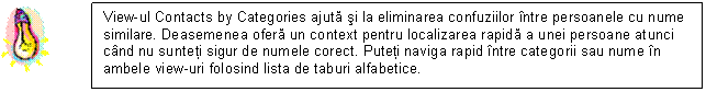Diferenta dintre view-urile Contacts si Contacts by Categories, pe langa sortarea pe categorii, consta in faptul ca butonul Categorize este vizibil in Contacts by Categories.