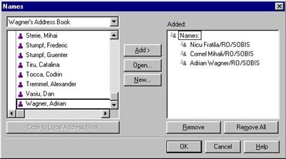 Daca dati click pe butonul ajutator din dreapta campului posesorului, va fi afisata o fereastra de dialog Names. Aici puteti selecta un Address Book sau directory si apoi alege persoanele sau grupurile dorite. Acestea din urma vor apare ca posesoare ale PAB-ului dvs.