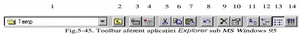 Toolbar (sub MS Windows 95): activeaza sau dezactiveaza bara cu utilitare. Bara cu utilitare contine butoane pentru anumite functii ale aplicatiei Explorer. O scurta descriere a butoanelor poate fi obtinuta prin pozitionarea cursorului mouse-ului pe butonul dorit; dupa o asteptare de cateva secunde, este afisata o eticheta cu denumirea butonului. Bara cu utilitare este similara cu cea din urmatoarea figura: