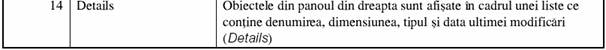 Details: obiectele din panoul drept al ferestrei Explorer sunt afisate in cadrul unei liste ce continedenumirea acestora (si eventual extensia, in cazul fisierelor), dimensiunea (in cazul fisierelor), tipul, data si ora ultimei modificari.