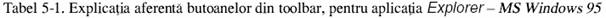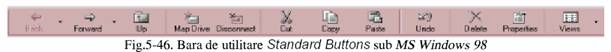 Standard buttons: se refera la bara de utilitare standard, similara cu cea din MS Windows 95. Deoarece din optiunea View Toolbars a barei de meniu specifica ferestrei aplicatiei Explorer a fost activata optiunea Text Labels, butoanele dispun de etichete cu denumirea lor. Daca optiunea Text Labels este dezactivata, atunci pentru a afla denumirea unui buton din Standard buttons, se pozitioneaza cursorul mouse-ului pe buton si dupa cateva secunde este afisat numele acestuia (ca in MS Windows 95
