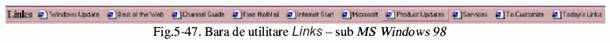 Links: afiseaza o bara de utilitare cu cel mai frecvent accesate adrese Web, prezentate sub forma de icon-uri. Fiecare buton corespunde unei adrese Web. Pentru a vizualiza adresa Web, se pozitioneaza cursorul mouse-ului pe butonul respectiv, si dupa cateva secunde este afisata adresa corespunzatoare.