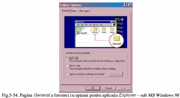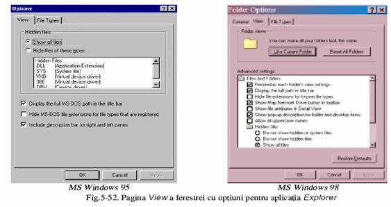Options (sub MS Windows 95) sau Folder Options (sub MS Windows 98): aceasta optiune permite specificarea tipurilor de fisiere ce vor fi afisate in fereastra Explorer, cat si ce informatii de stare vor fi vizualizate pentru respectivele fisiere. In momentul selectiei optiunii Option, pe ecran va fi afisata o fereastra cu mai multe pagini de configurare (doua sub MS Windows 95 si trei sub MS Windows 98