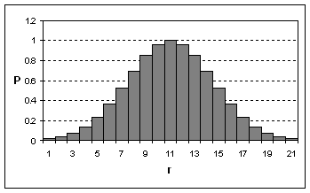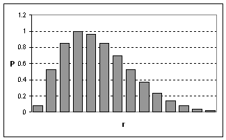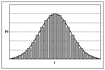 Se defineste evenimentul favorabil (succes), ca fiind extragerea unei bile negre; prin urmare, extragerea unei bile albe este un esec sau o non-realizare a evenimentului favorabil. Putem spune ca Pr reprezinta probabilitatea de a avea r succese din n experiente succesive. Termenii respectivi ai distributiei binomiale, vor reprezenta deci in ordine probabilitatile de a avea 0, 1, 2, 3, ., r, . succese din n experiente repetate (Figura 8.13).