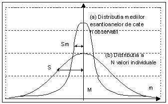 Se arata efectiv ca daca dintr-o populatie de efectiv N foarte mare se extrag la intamplare esantioane de efective diferite n1, n2, avand respectiv pentru medie valorile m1, m2 si ca s-au facut un numar mare de astfel de experiente, diferentele (m1 m2) se repartizeaza urmand o distributie normala in jurul valorii zero (reprezentata in eventualitatea m1=m2=M).