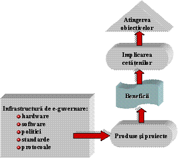 O strategie de e-guvern bine conceputa si pusa in practica ar trebui sa genereze o multitudine de beneficii. Pentru a obtine un astfel de rezultat, trebuie sa fie indeplinit un numar mare de conditii, pornind de la conceperea infrastructurii tehnice si organizatorice si pana la constructia efectiva (tabelul 1).