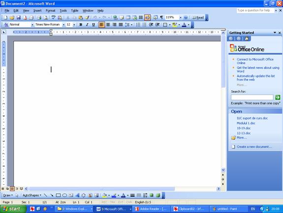La deschiderea aplicatiei ati putut observa o suprafata de lucru identica foi de scris. In bara de meniuri se poate observa denumirea implicita: Document2.doc - Microsoft Word. Aceste elemente sunt date de un sablon (template) cu numele de Normal.dot.