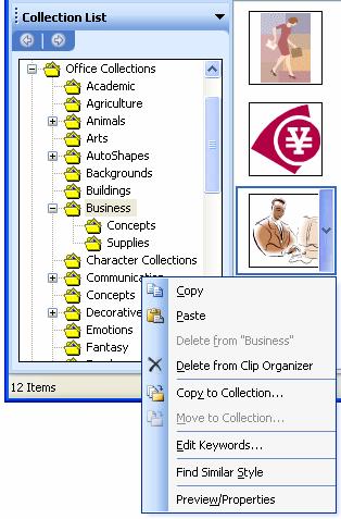 Deschideti structura Office Collections, va alegeti unul din domeniile prezentate (ex. Business), apoi imaginea dorita. Cand faceti click pe imagine observati aparitia unui buton cu sageata, ceea ce denota prezenta unui meniu. Alegeti din meniu optiunea Copy (Copiere). Faceti click in text in zona unde doriti sa puneti imaginea, click dreapta mouse, Paste (Lipire).