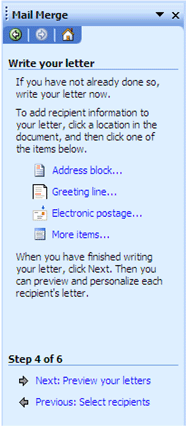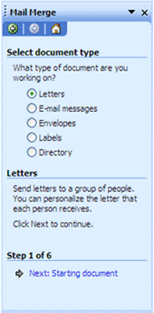 Din meniul Tools - Letters and Mailings alegeti optiunea Mail Merge In zona de activitati se va deschide o fereastra pe care va trebui sa o analizati din doua puncte de vedere: