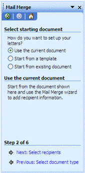 Pasul 1 La primul pas trebuie sa alegeti ce tip de document de baza folositi (scrisoare, plic, altele). Vom folosi ca document de baza scrisoarea. Pasul 2 Daca documentul este deschis (e vorba de scrisoarea pe care tocmai ati creat-o) alegeti prima optiune (Use the current document). Daca nu puteti apela la un sablon (template) sau un document facut deja, dar care urmeaza sa fie deschis. |