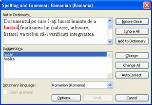 Dupa cum se observa textul gresit este trecut cu rosu. Aveti dedesubt o lista de sugestii (poate sa nu existe aceasta lista). Aveti o serie de situatii de raspuns: Ignor Once - ignorati de aceasta data Ignore All - ignorati toate de acest fel (de ex. nume proprii) Add to Dictionary - nu se gaseste in dictionar (ex. neologisme) Change - schimbi pe baza sugestiei Change All - le schimba pe toate de acest gen (daca sunteti siguri) AutoCorrect (lasati calculatorul sa hotarasca) |