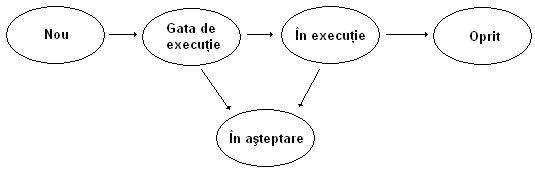 In timpul executiei, procesul isi schimba starea ( definita ca activitate curenta a procesului ) care poate fi: nou ( new ), activ ( active ), in asteptarea unui eveniment waiting ) sau oprit ( halted ). In sistemele cu multiprogramare procesele active pot astepta alocarea UC ( adica pot fi gata de executie ( ready ) ) sau pot sa fie deja in posesia acesteia (