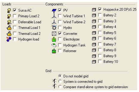 In sectiunea 1 se aleg echipamentele care sunt montate in sistemul de generare in cazul de fata: componente - PV, invertor si acumulatori, sarcina de curent alternativ (CA), iar in Figura 2 se prezinta alegerea/adaugarea acestor componente.