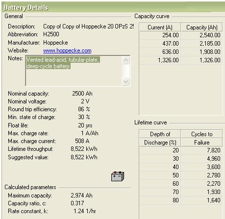 In zona de alegere a acumulatorilor s-a ales un acumulator cu caracteristicile acoperitoare celui ales in capitolul de dimensionare si a fost introdus numarul lor si pretul acestora: Hoppecke 20 OPzS 2500 ai carui parametrii se pot vedea in Figura 7.