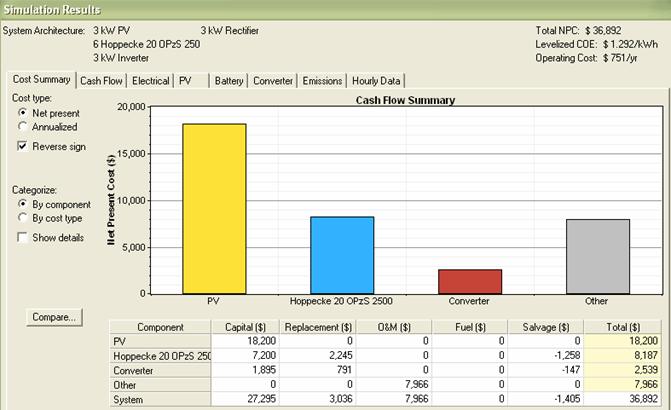 O prima analiza implica rezultatul din punctul de vedere al costurilor sistemului. Se vede ca 61% din costul sistemului reprezinta panourile solare, urmate in ordine de invertor (20%) si baterii (18%) si ca costul total este 36.892 de dolari .