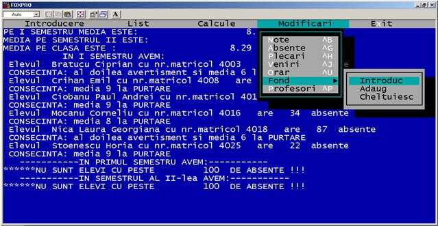 Evidenta absentelor si acordarea de avertismente si chiar exmatricularea (stergerea din baza de date) elevilor care au acumulat un numar mare (definit de gestionar) de absente;