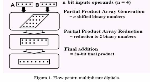 Multiplicarea digitala poate fi vazuta ca o serie de shiftari de biti si adunari, in care doua numere, inmultitorul si deinmultitul sunt combinate pentru obtinerea rezultatului final. Consideram multiplicarea a doua numere, multiplicatorul P si deinmultitul C, in care P este un numar pe n biti cu reprezentarea pe biti , cel mai semnificativ bit fiind pn-1 si cel mai nesemnificativ p0; C are o reprezentare similara . Pentru multiplicari fara semn, se aduna pana la n copii shiftate ale deinmultitului pentru a forma rezultatul. Toata procedura este divizata in 3 pasi: generarea produselor partiale (PP), reducerea produselor, si adunarea finala.Acestea sunt ilustrate conceptual in Fig. 1. Pentru a gasi o structura convenabila si rapida, ar trebui sa consideram diferite structuri ale multiplicatorului.