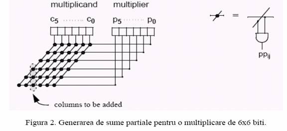 Reprezentarea la nivel de bit a acestei functii se poate implementa utilizand o poarta logica AND, care realizeaza AND (ci,pj), i = 0 to n-1, j = 0 to n-1. Valorile rezultate suunt denumite biti de produse partiale sau, mai simplu, produse partiale; daca aranjam aceste produse partiale dupa pozitia bitilor din inmultitor, (bp = i + j), ajungem la o structura prezentata in Fig. 2. In aceasta proiectare, bitii produselor partiale sunt aranjati pe coloane; ei vor fi toti adunati pentru a forma valoarea finala. Structura trapezoidala rezultata este denumita vector de produse partiale (partial product array) sau mai simplu PPA. Acest pas este denumit generare de vectori de produse partiale (partial product array generation).