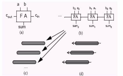 Figura 3. Adunarea produselor partiale. (a) Celula FA. (b) Sumatorul ripple-carry. (c) Se poate folosi tehnica de ripple carry pentru a aduna versiunile shiftate ale deinmultitului. (d) Deoarece sunt n-1 sumatoare ripple carry, fiecare de dimensiune n, aceasta metoda este de complexitate O(n2).