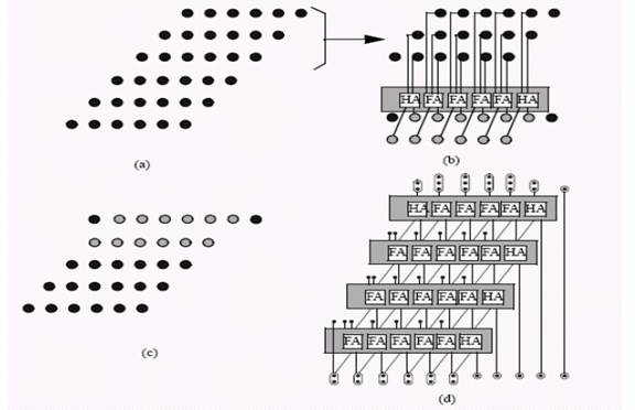 De exemplu, in Figura 4a, se observa PPA-ul generat de o multiplicare de 6-biti cu 6-biti. Putem aduna primii trei vectori de biti utilizand FA, ca in Figura 4b. Rezultatul final se obtine combinand acest rezultat cu restul vectorilor de biti, ca in Figura 4c. Dupa cum se vede, cei trei vectori au for redusi la 2 vectori de biti.