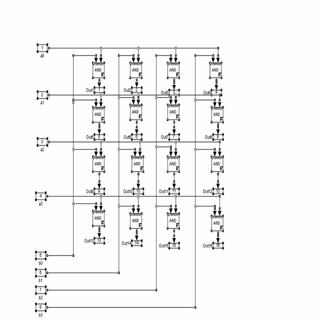 Am implementat o structura folosind 2 subsisteme, pentru a fi mai usor de urmarit schema. Unul format din 16 porti AND care realizeaza produsele partiale, organizate sub o forma matriciala pentru a fi mai usor de urmarit, si al doilea format din primul plus o serie de Full-Addere si Half-Addere, care formeaza impreuna structura multiplicatorului.