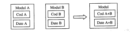 Este cea mai putin recomandata. Ea este adeseori intalnita in cazul programarii in limbaje de asamblare. Fiecare modul are propriul sau cod de date si propria sa zona de memorie. Pot fi utilizate codurile din oricare modul, deoarece nu exista nici un mecanism pentru a preveni aceasta. Un argument al acestei utilizari este evitarea dublarii unei secvente de cod sau a unei zone de date, daca acestea exista deja in alt modui. Doua module astfel conectate par a fi un singur modui (figura ).